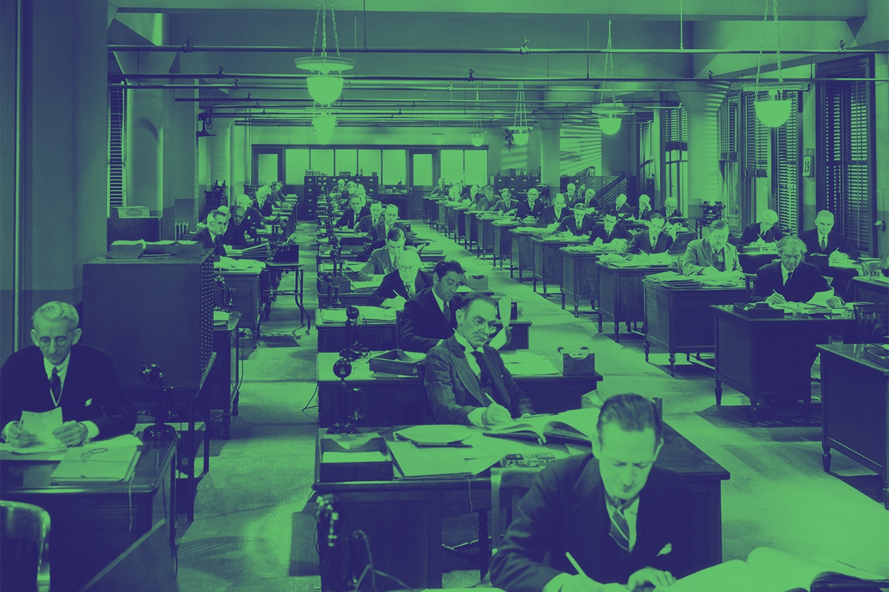 Mass production of office equipment such as desks, chairs, typewriters, and adding machines, coupled with enthusiasm for Frederick Winslow Taylor’s book The Principles of Scientific Management on how to extract the maximum productivity from workers, found expression in offices engineered to mechanize human workers (as human labor) at scale while affording managers a panoptic view of the shop floor.